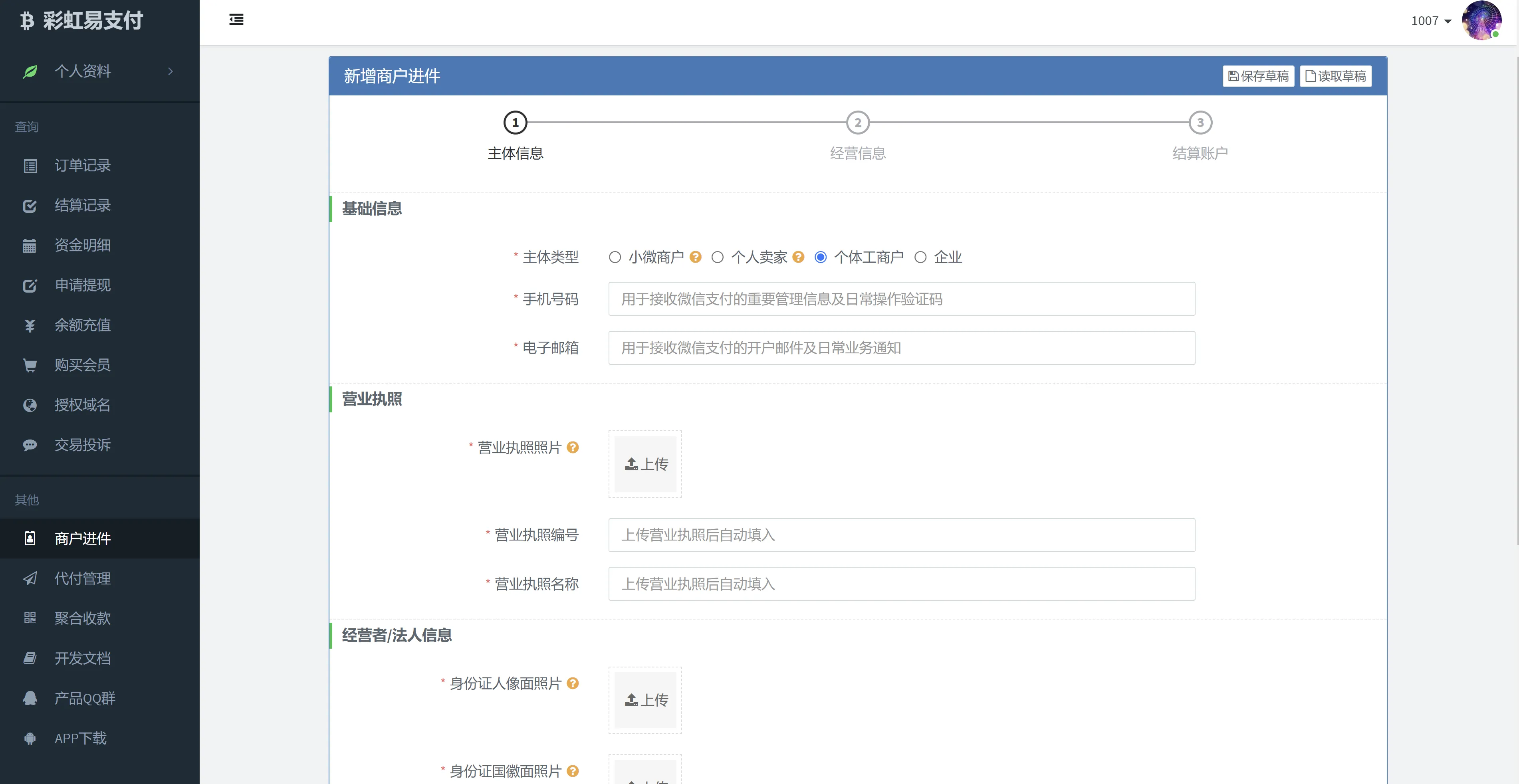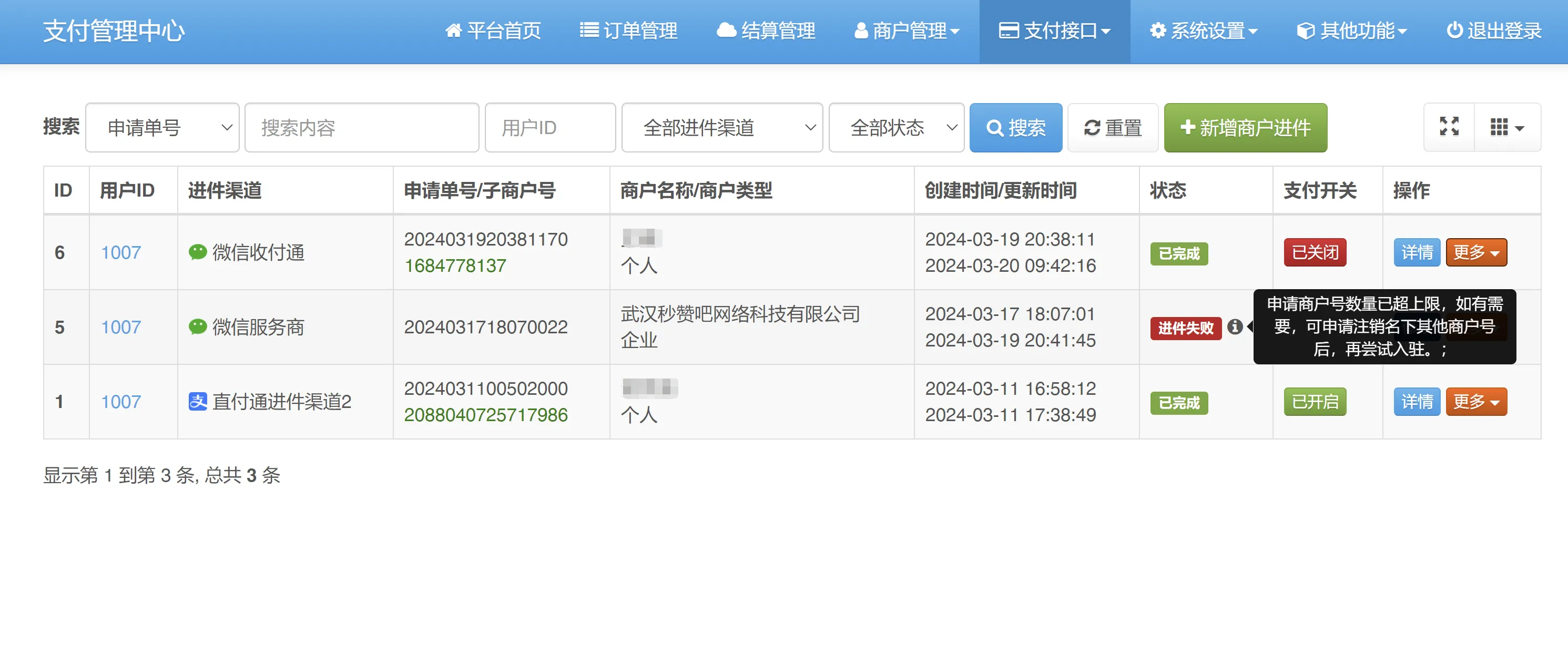 商户进件插件,支持多个进件渠道类型,并且可扩展。目前已有《支付宝服务商》、《支付宝直付通》、《微信支付服务商》、《微信支付收付通》、《快钱支付》、《新生易》、《汇付斗拱》等进件渠道类型。